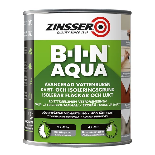 B-I-N® AQUA är en banbrytande avancerad, högpresterande, vitpigmenterad kvist- och isoleringsgrund. B-I-N® AQUA kombinerar en snabb torktid med en oöverträffad vidhäftning och bästa möjliga täckkraft.