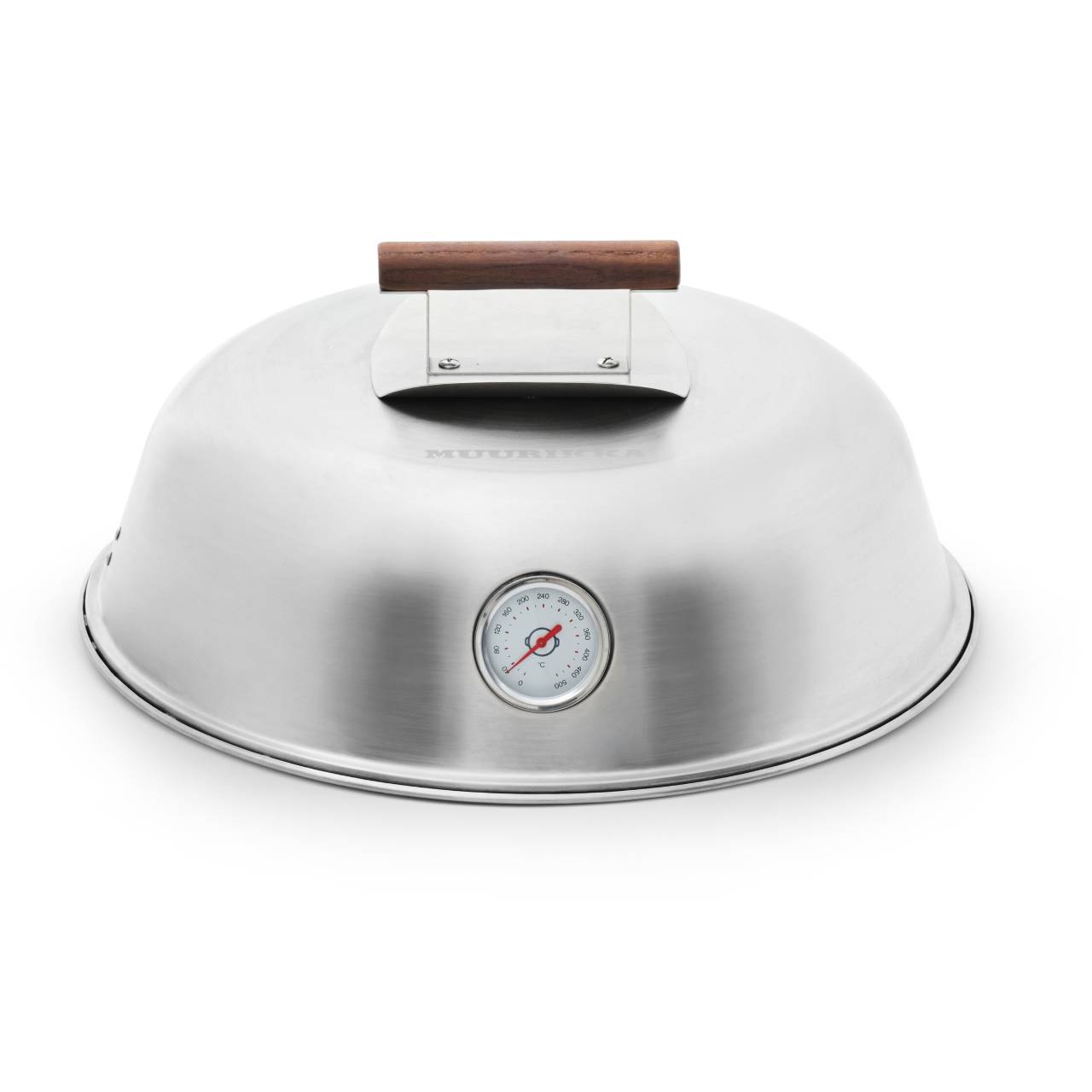Lock av rostfritt stål med termometer som passar till Muurikka stekhäll 58 cm. Håller maten varm längre och gör tillagningen snabbare.